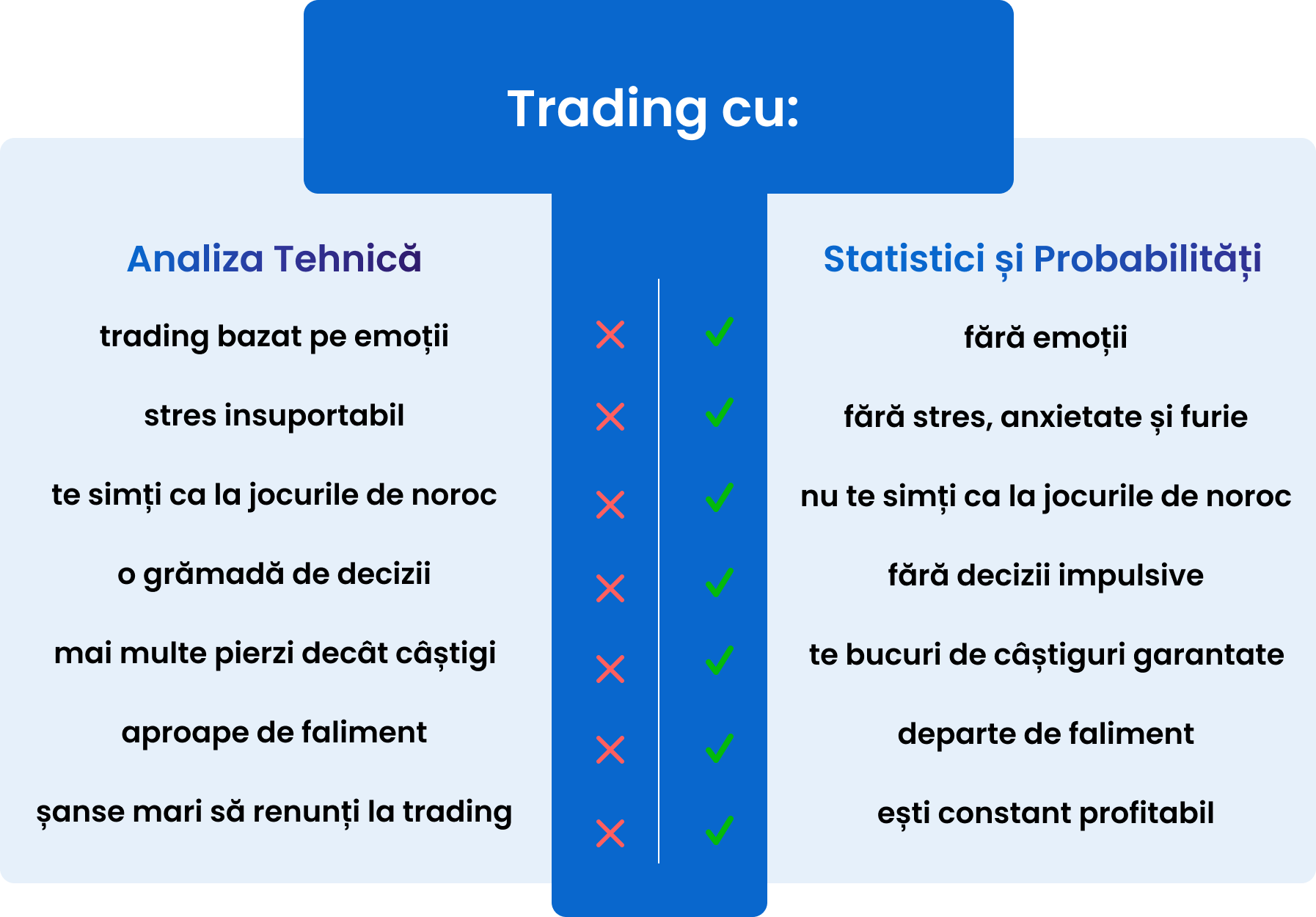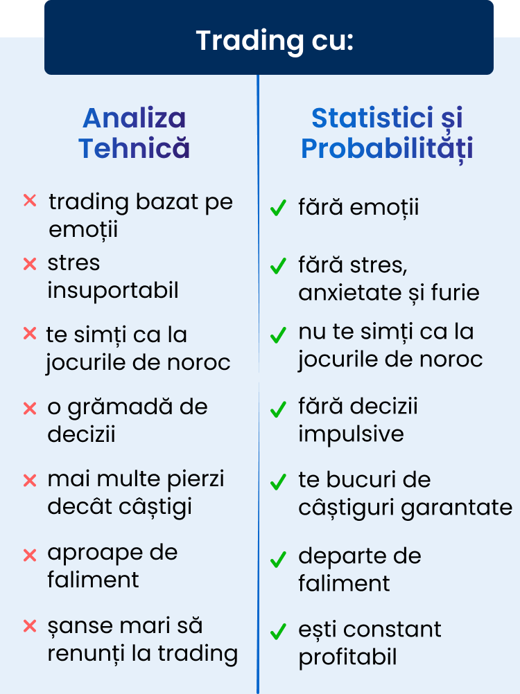 Ajutăm traderii să fie constant profitabili, tranzacționând cu Statistici și Probabilități doar 10-20 de minute pe zi